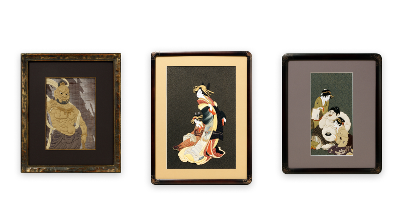そのほか複雑な着物のドレープや指先・目鼻といった小さなパーツまでを筆で描くのではなく、押し絵で表現しています。